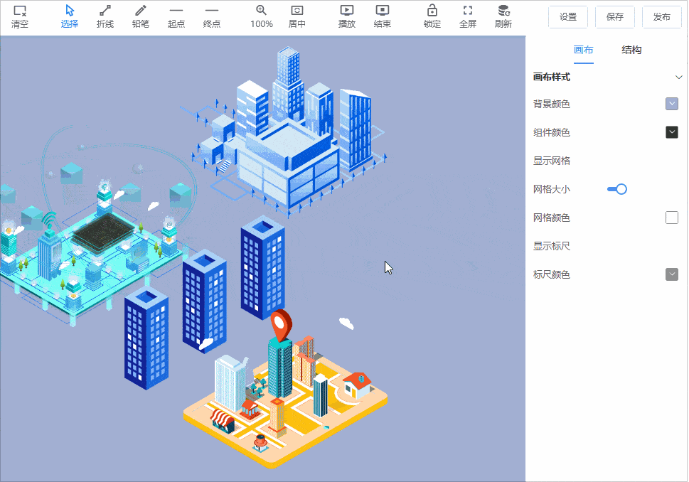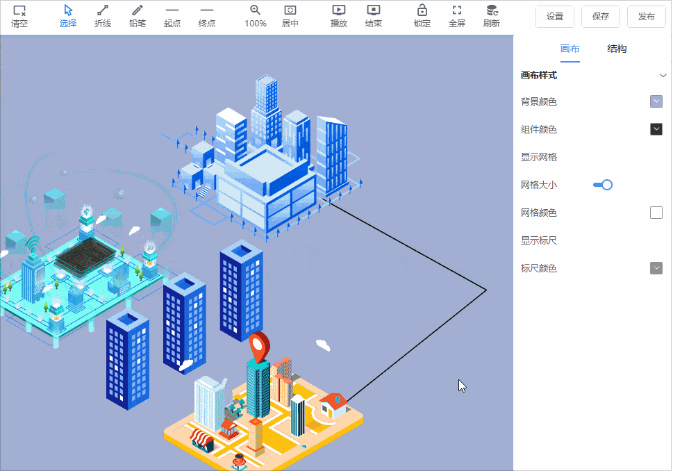 连线支持多种动画效果,包括水流、虚线、圆点等,可以更加生动的展示信号、能量、数据、信息的流动,适用于各种物联网场景。