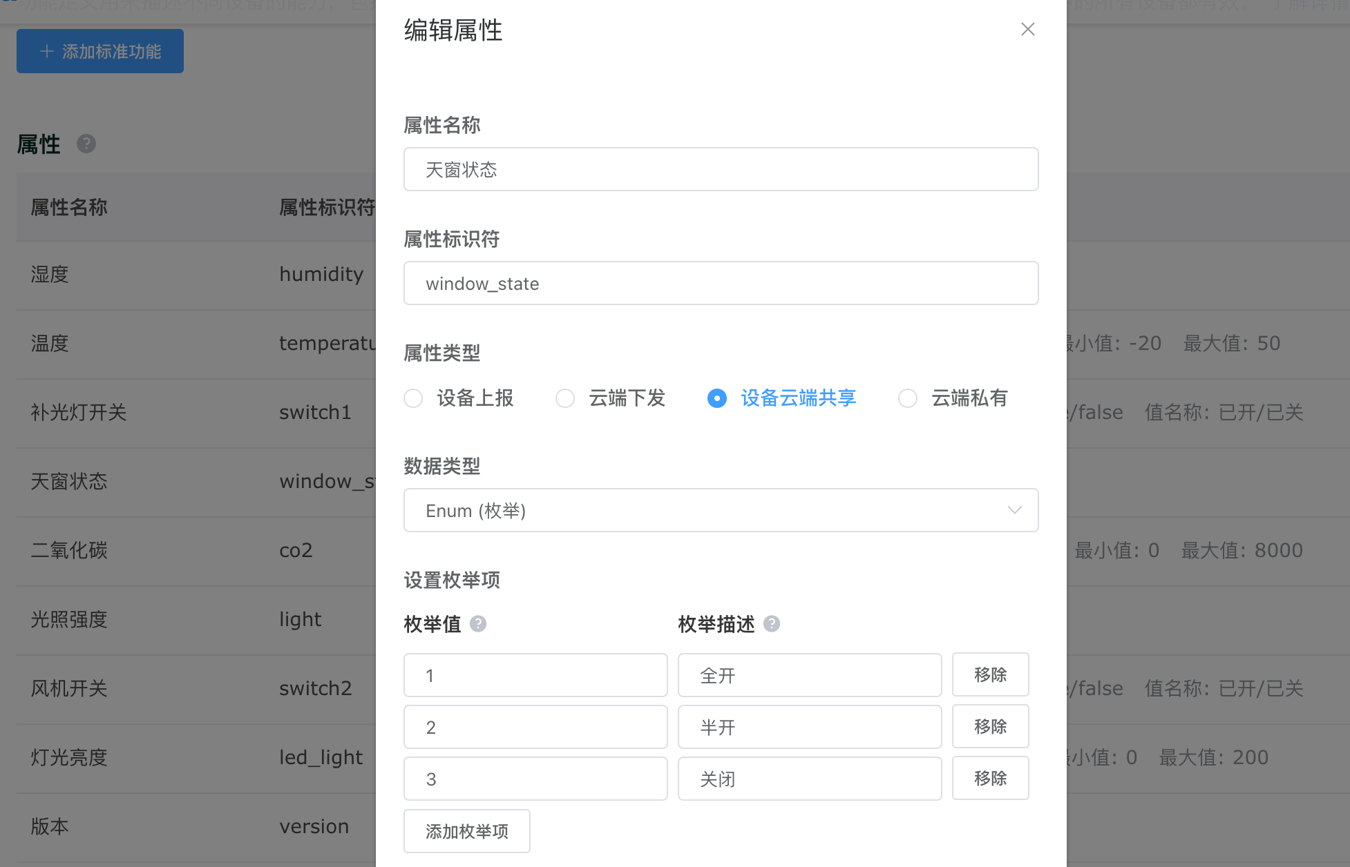 通过设备类型中的属性定义,可以快速为添加一个枚举类型的属性定义,如下图: