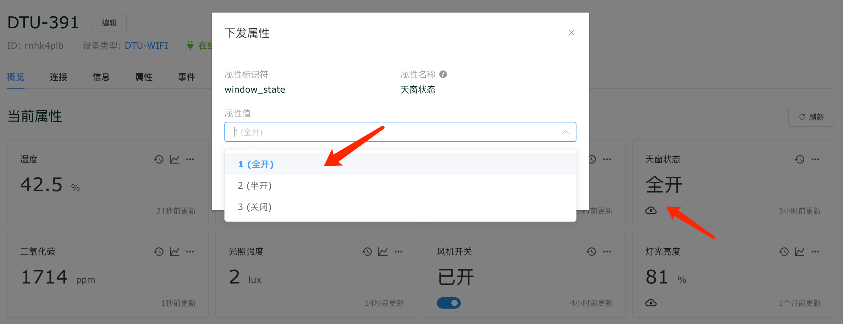 需要注意的是,WutongCloud 中的设备枚举属性值,不仅支持数字,也支持使用文本,例如: