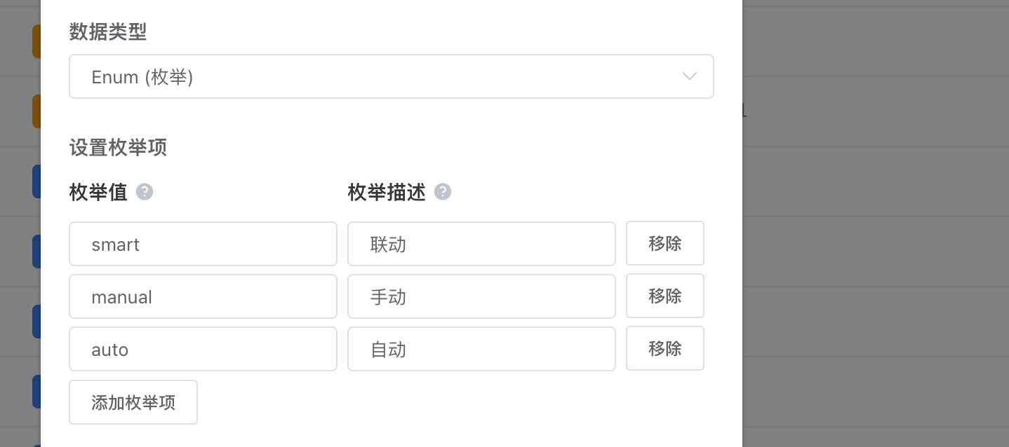 不同于开关量类型属性只能有两个值,枚举类型的属性可以是多个预设的值,并且每个枚举值可以设置枚举描述文字,这使得枚举类型很适合用于多个固定状态切换的设备属性,例如: